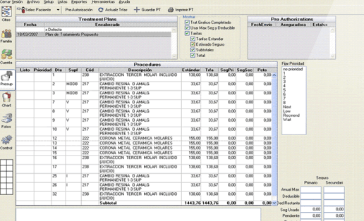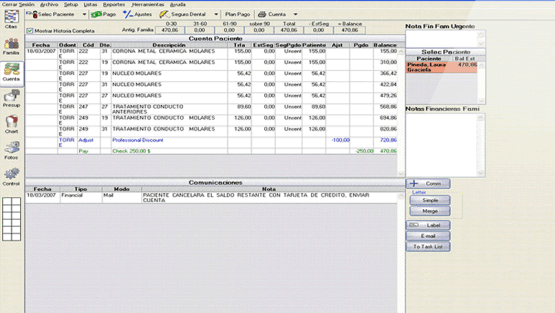 El Módulo Cuenta le permite registrar los pagos y descuentos por paciente, el mismo es semi-automático ya que todos los procedimientos marcados como "completados" pasan inmediatamente a este Módulo y todo que que tiene que hacer es ingresar los pagos que el paciente realice así como los descuentos o cargos financieros, el Módulo también le permite crear un plan de pagos a crédito con tasas de interés anual y además puede imprimir la cuenta del paciente, en un formato similar al de cualquier estado de cuenta bancario o de tarjeta de crédito.